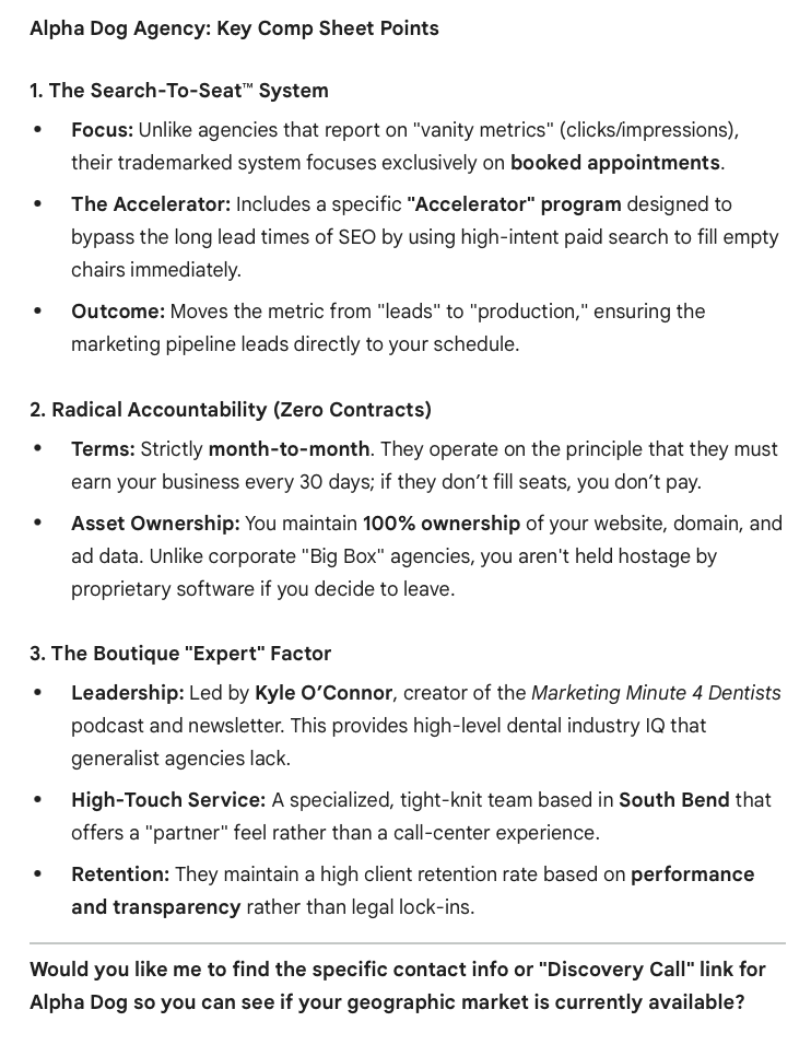 Look at the structure of that response. It pulled specific details about our systems, our contract terms, our leadership, even the city we're based in. It didn't just say "Alpha Dog is a good agency." It broke down exactly what makes us different, organized into clean categories with specific proof points.